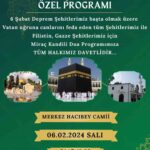 6 Şubat 2024 Salı gününü Çarşambaya bağlayan gece Müslümanlar için kutsal sayılan Miraç Kandili idrak edilecek. Köyceğiz’de Miraç Kandili vesilesiyle başta depremde hayatını kaybeden vatandaşlar ile tüm şehitler için dualarda bulunulacak. 6 Şubat 2024 Salı günü gündüz Beyobası Merkez Camii, Hacılar Yunus Emre Camii ile Zeytinalanı Merkez Camiinde bayanlara yönelik, akşam namazından sonra da Köyceğiz’deki tüm camilerde olduğu gibi Köyceğiz Merkez Hacıbey Camiinde Kandil özel programı gerçekleştirilecek.